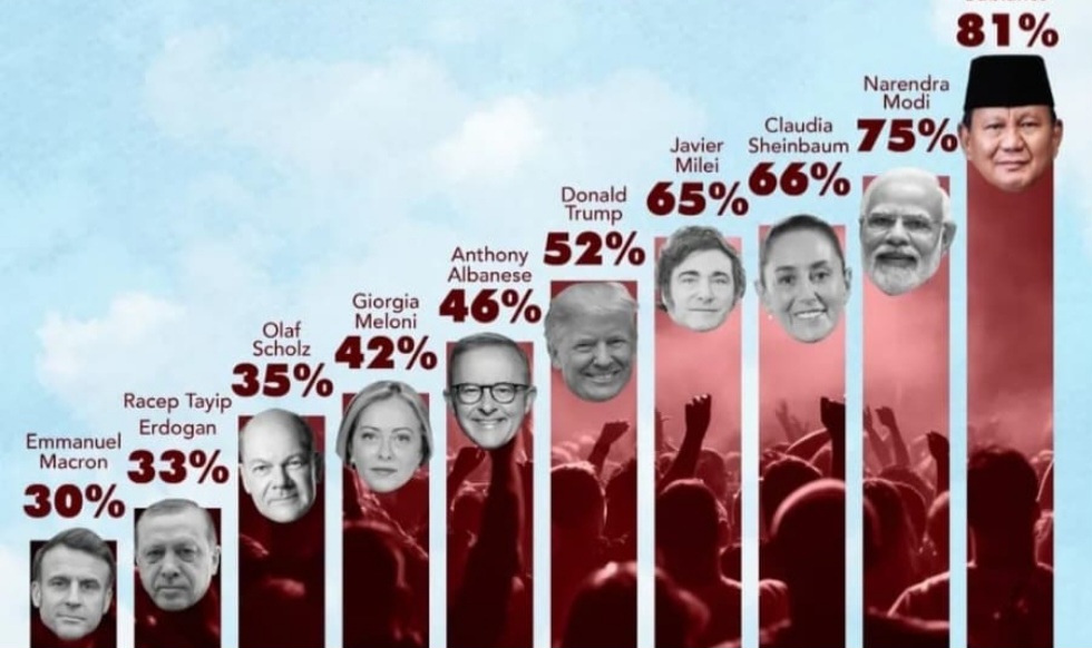 Sebaliknya, sejumlah pemimpin Eropa justru menghadapi tingkat kepuasan yang rendah. Presiden Prancis Emmanuel Macron, Presiden Turki Recep Tayyip Erdogan, dan Kanselir Jerman Olaf Scholz masing-masing hanya meraih approval rating di bawah 36 persen.