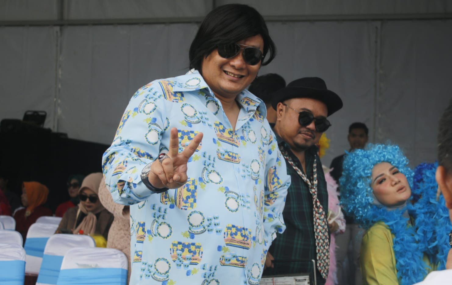 Bukan hanya karena kehadirannya sebagai pejabat publik, namun penampilannya yang nyentrik membuat pengunjung melongo. Hamzah tampil beda dengan mengenakan outfit ala tahun 70-an: celana cutbray, kemeja bermotif mencolok, rambut palsu, dan kacamata hitam model Ray-Ban.