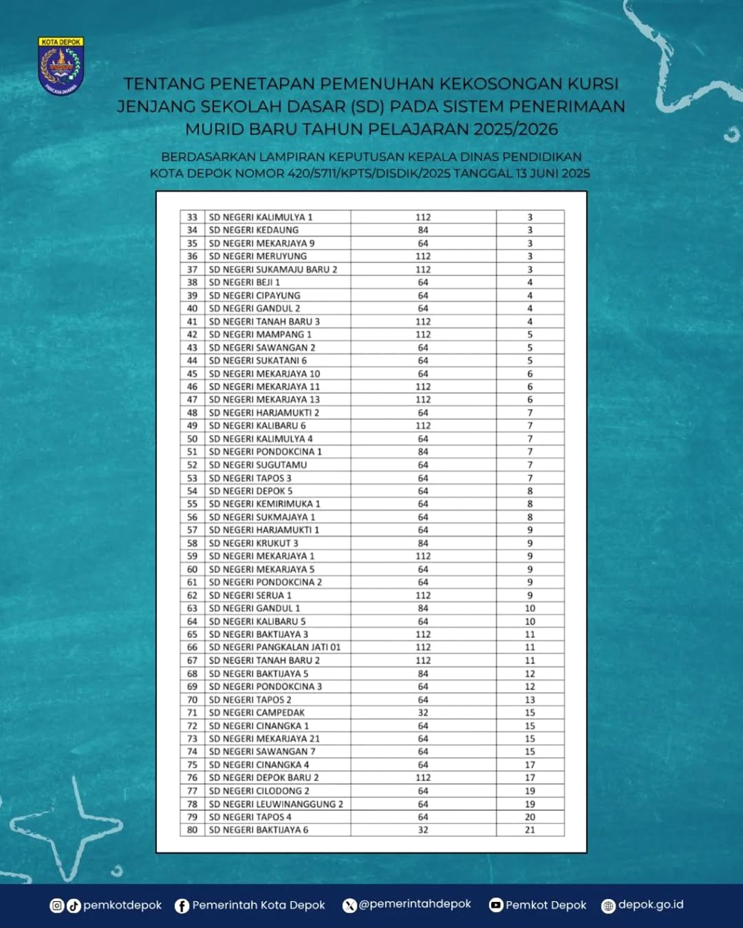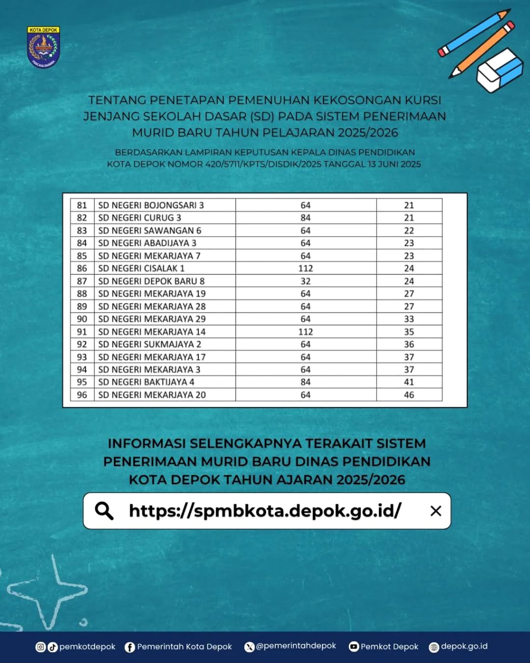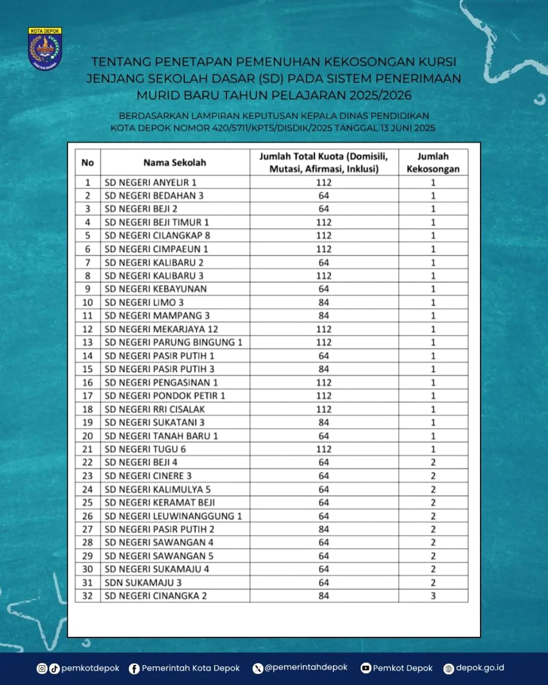 Dasar pelaksanaan pemenuhan kuota ini tercantum dalam Keputusan Kepala Dinas Pendidikan Kota Depok Nomor 420/5711/KPTS/DISDIK/2025, tertanggal 13 Juni 2025.