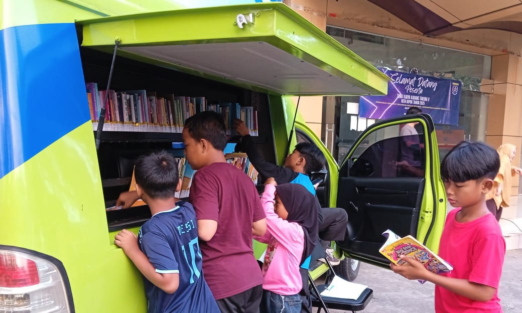 Mobil itu diparkir tepat di depan gedung Perpustakaan Umum Kota Depok, menampilkan deretan buku anak dan cerita bergambar yang langsung diserbu anak-anak. Mereka tampak antusias memilih buku, duduk di tikar, dan sesekali saling menunjuk isi cerita yang menarik.
