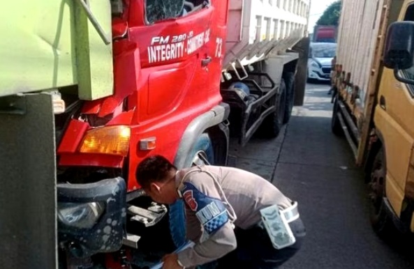 Truk yang tertabrak kemudian terdorong dan menabrak kendaraan lain di depannya.