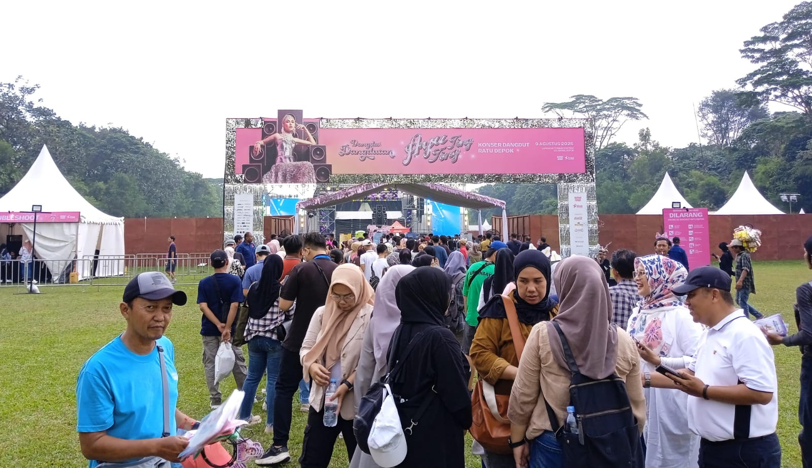Pantauan di lokasi pukul 17.30 WIB, antusiasme warga tetap tinggi meski hujan mengguyur. Warga dari berbagai wilayah di Depok dan sekitarnya sudah memadati area konser. Panggung megah telah disiapkan, sementara petugas sibuk memastikan persiapan teknis berjalan lancar.