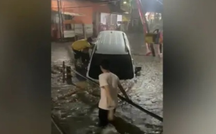 Mobil yang dikendarai oleh seorang ayah bersama dua anaknya terjebak banjir saat melintasi jalan yang digenangi air hujan deras.