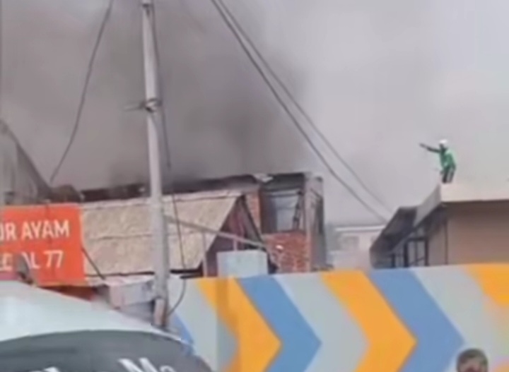 Aksi ojol tersebut sontak menjadi pusat perhatian warga dan pengguna jalan yang melintas di sekitar Pasar Palmerah. Dengan inisiatif berani, pria berjaket ojol tersebut terlihat memanjat atap bangunan di sebelah kios yang terbakar.