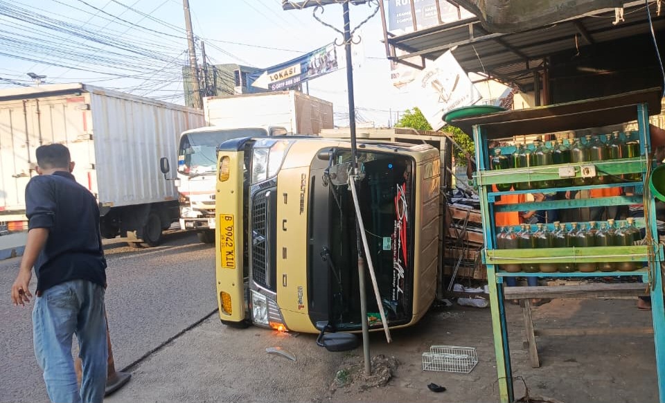 BOGOR, INDORAYA TODAY – Sebuah kejadian unik terjadi di Jalan Raya Setu, Pasir Angin, Cileungsi, Kabupaten Bogor, Kamis (16/10/2025). Sebuah truk tiba-tiba terguling sendiri setelah mengalami kebocoran ban, namun untungnya tidak menimbulkan korban jiwa.