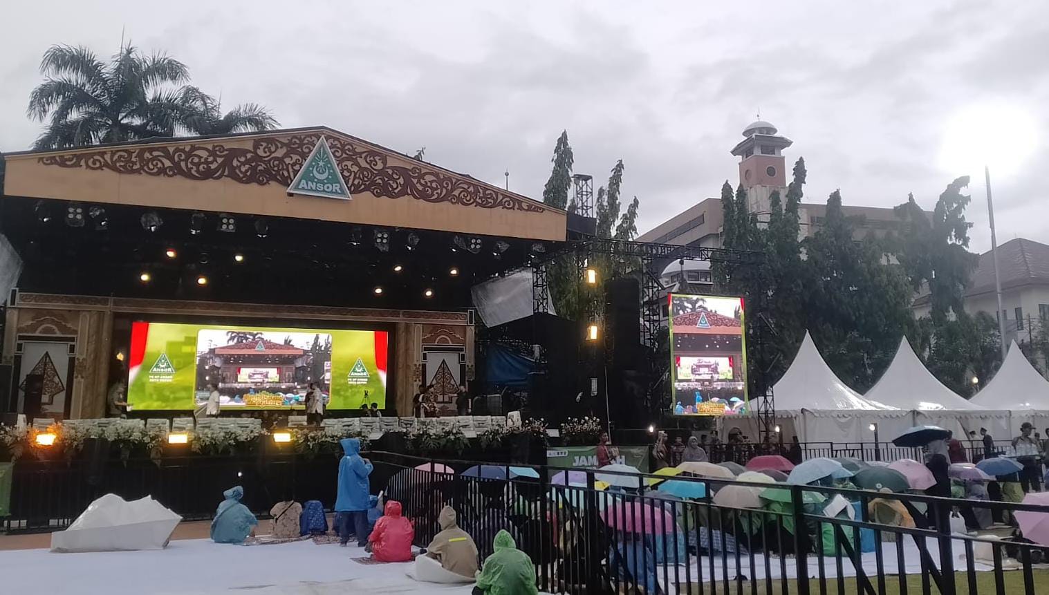 Pantauan di lapangan pada pukul 17.45 WIB, hujan gerimis yang mengguyur tak membuat jamaah beranjak. Banyak di antara mereka membeli tikar dari pedagang keliling untuk alas duduk, lantaran sebagian karpet yang disiapkan panitia sempat basah terkena air hujan.