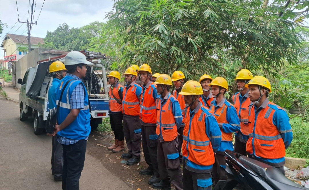 PLN UP3 Depok bersama ULP Cimanggis menggelar pemeliharaan jaringan Saluran Udara Tegangan Menengah (SUTM) dan pembersihan Right of Way (ROW) secara gabungan di Kampung Kebayunan, Tapos, Senin (1/12/2025).