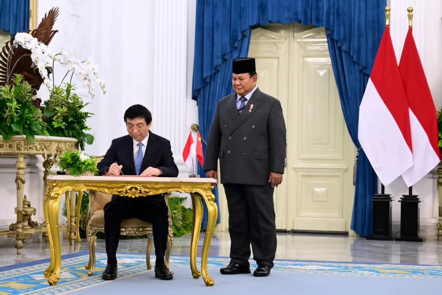 AKURAT JAKARTA — Presiden Republik Indonesia, Prabowo Subianto, menerima kunjungan kehormatan dari Ketua Majelis Permusyawaratan Rakyat (MPR) Republik Rakyat Tiongkok (RRT), Wang Huning, di Istana Merdeka, Jakarta, pada Kamis (4/12/2025).