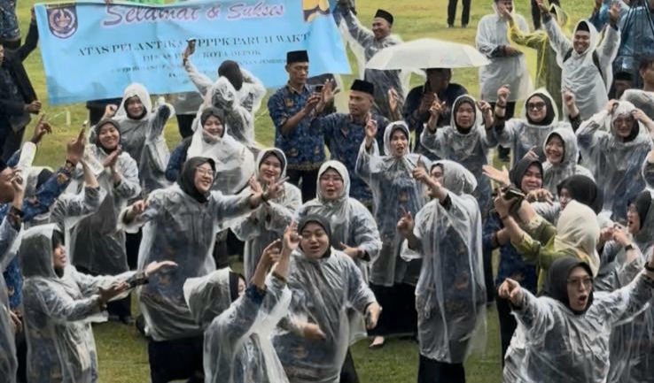Alih-alih meninggalkan lokasi, suasana justru semakin semarak. Iringan musik yang diputar panitia membuat ribuan calon PPPK yang berada di lapangan maupun tribun stadion berjoget bersama, menciptakan suasana meriah meski hujan terus turun.