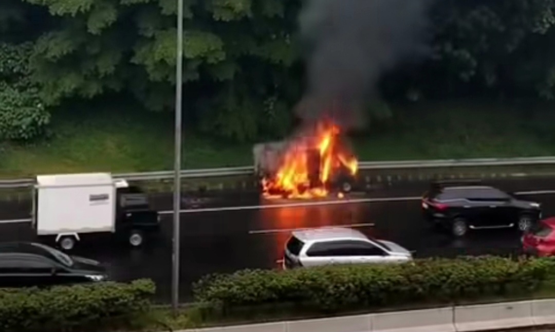 Dalam rekaman video yang beredar di media sosial, api terlihat berkobar hebat menghanguskan seluruh bagian badan mobil boks tersebut di bahu jalan tol. Beruntung, petugas pemadam kebakaran yang tiba di lokasi bergerak sigap melakukan lokalisir api.