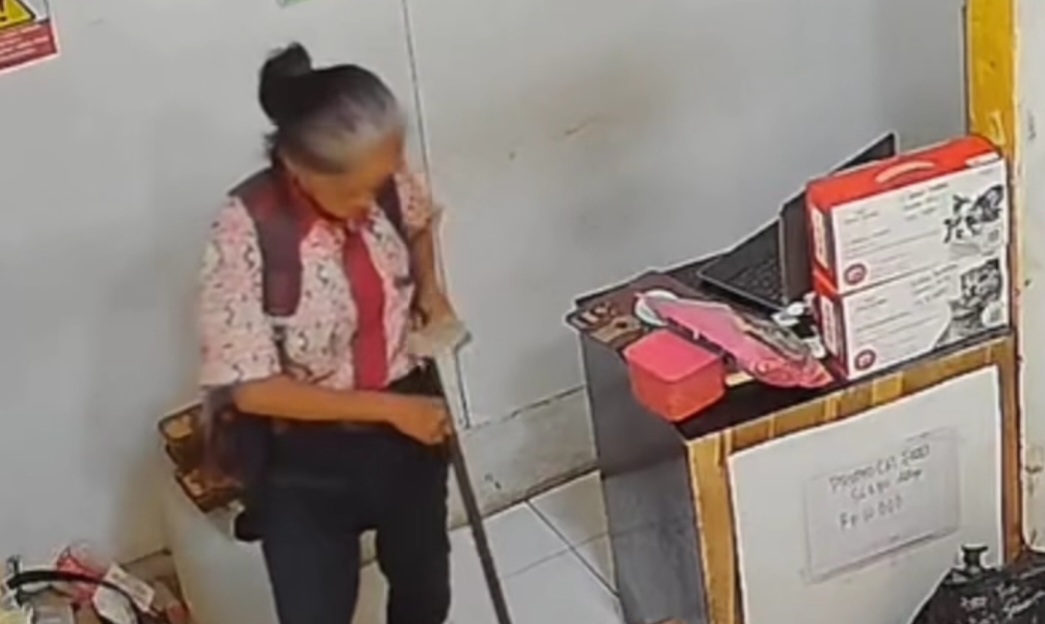 Pelaku yang viral di media sosial ini diduga seorang perempuan lanjut usia yang berjalan menggunakan tongkat.