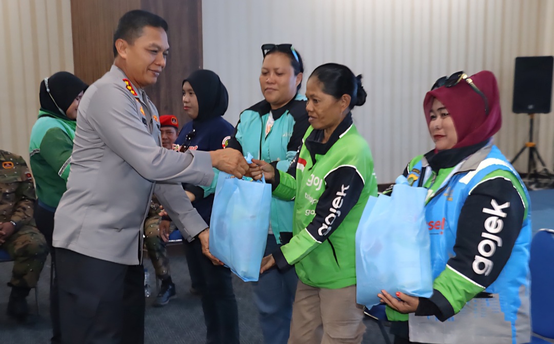 Dalam kegiatan tersebut, Polres Metro Depok menyalurkan 75 paket sembako kepada perwakilan Potmas dan ojol sebagai bentuk kepedulian terhadap masyarakat.